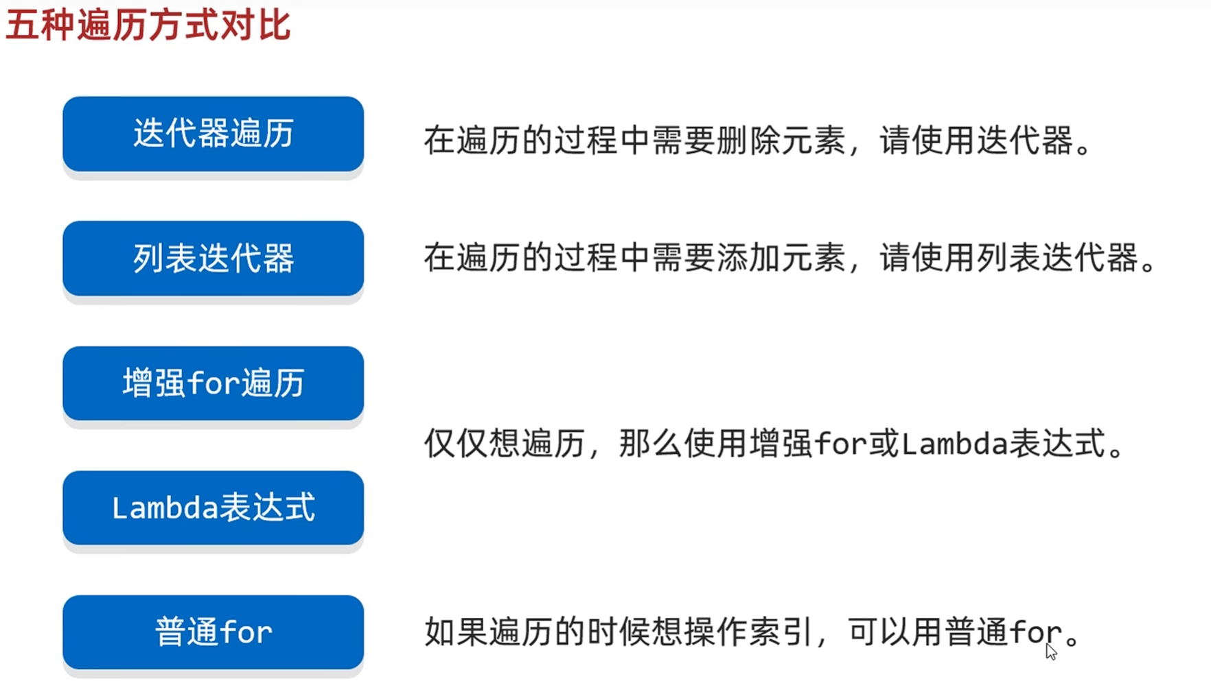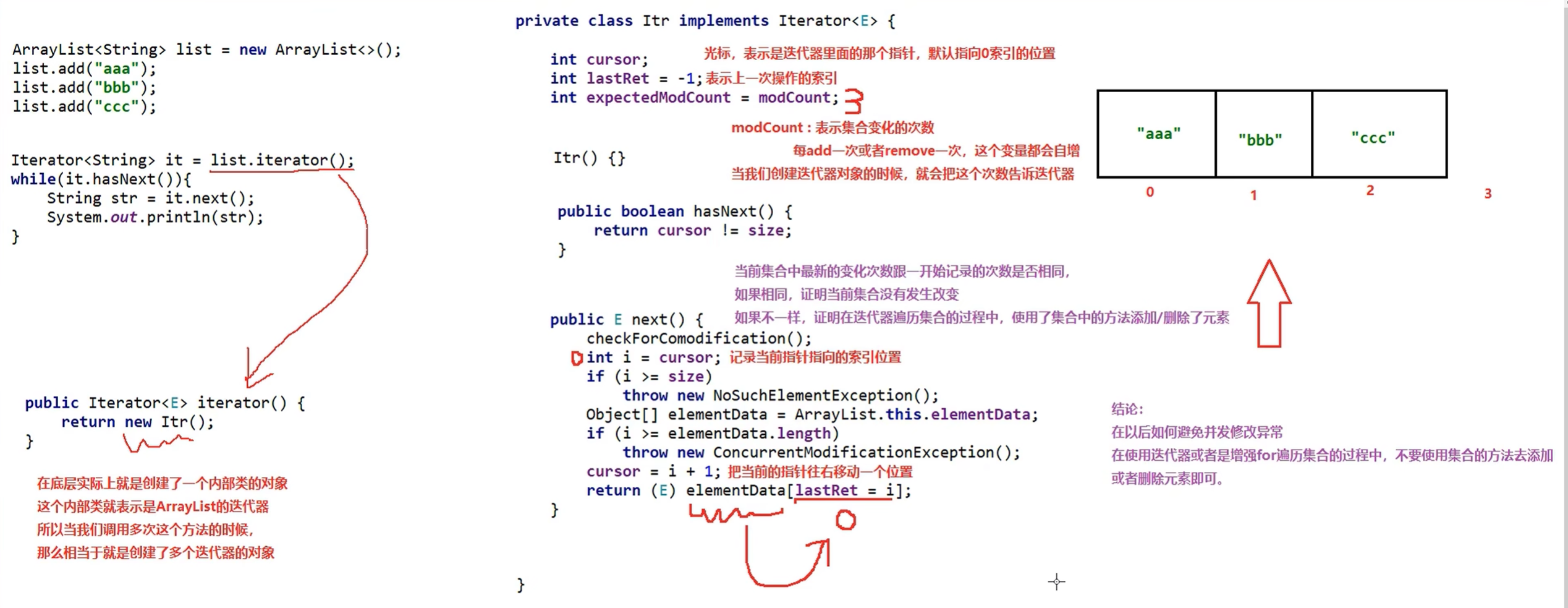 - 迭代器遍历时,不能用集合的方法进行增加或者删除 ,只能用it.remove()